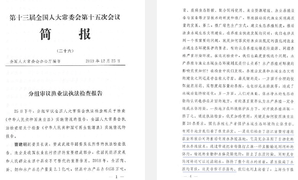 2019年9月25日,全國人大常委副委員長曹建明帶隊考察公司。 2019年底,曹委員長在第十三屆全國人大常委會第十五次會議上點名表揚公司模式。 “有兩個地方我們看來很受啟發(fā)。一是我們檢查了浙江諸暨市清湖農(nóng)業(yè)科技公司的自動化清水養(yǎng)殖基地,它是完全采用了自動化的清水養(yǎng)殖技術(shù),通過管道把食物像打點滴一樣直接輸送到河鮮的體內(nèi),輸送的食物和水體是隔絕的,防止了水質(zhì)污染。同時覓食的河蚌還可以過濾湖水,保持了整個湖水的清澈,甚至提高了水質(zhì)的登記,這是非常不容易的”