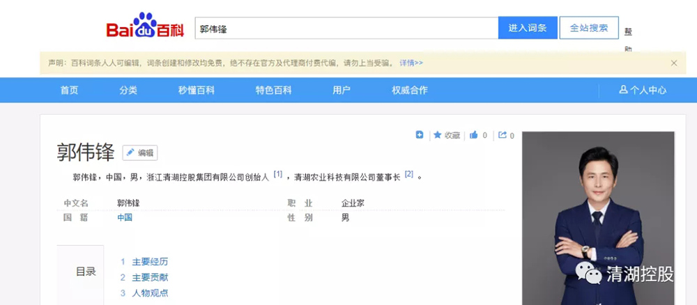 | 郭偉鋒先生 清湖控股董事長榮登百度百科企業(yè)人物 |